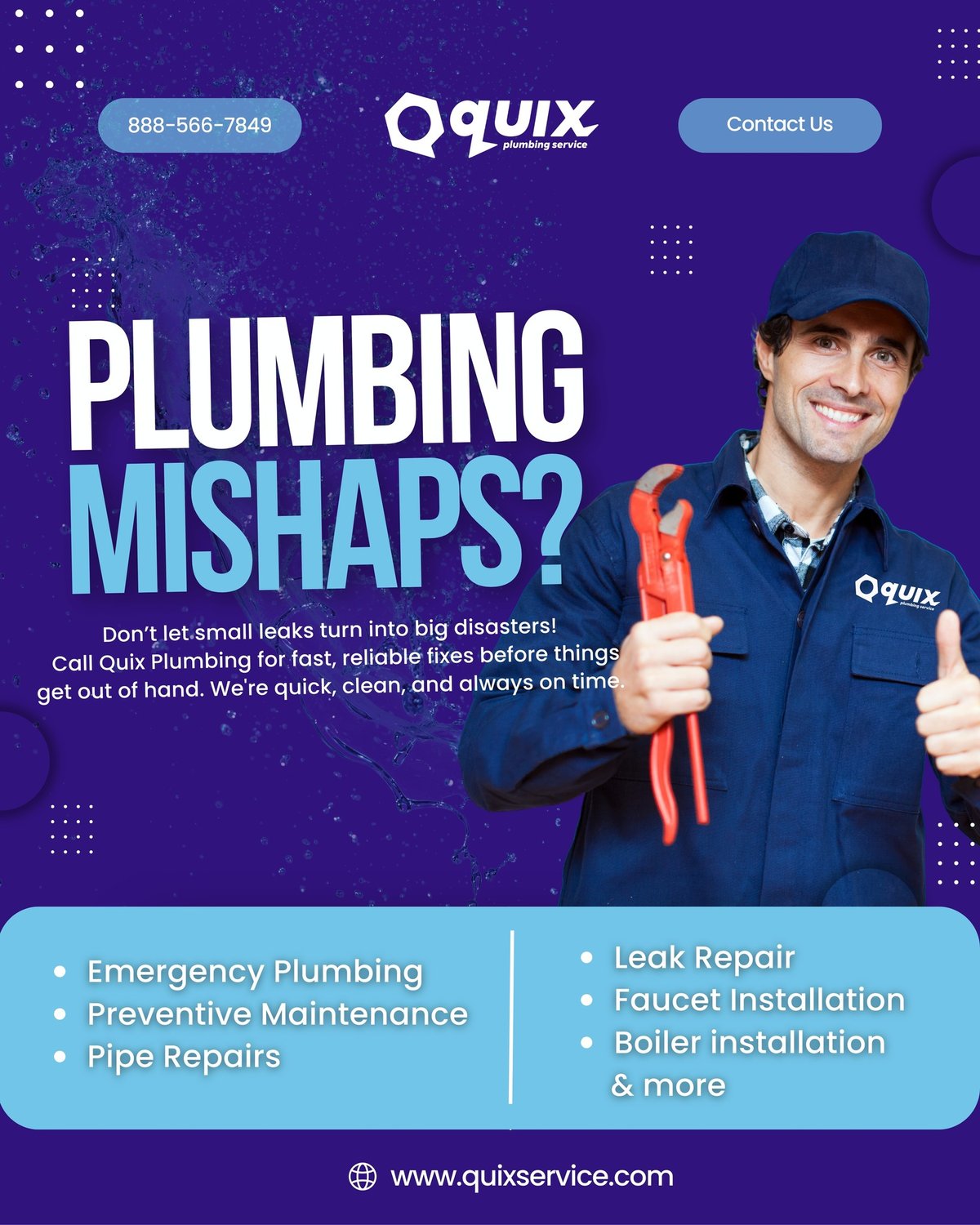 Quix Plumbing Service is a Brooklyn-based plumbing company founded in 2018, serving the Brooklyn, Queens, and Bronx neighborhoods of New York City. With a team of 51-200 employees, Quix focuses on delivering a superior and stress-free plumbing experience to building owners, management companies, and direct customers. They specialize in a wide range of services including plumbing repairs, heating, pipe and gas line repair, faucet and sink installation, septic tank services, drain and toilet repair, water heaters, boilers, and backflow services. Quix is committed to quality workmanship, transparent billing, real-time ETA tracking, and leaving no mess behind—ensuring peace of mind and reliability with every job. Their mission is to be a trusted partner known for timely, efficient service and outstanding customer care.